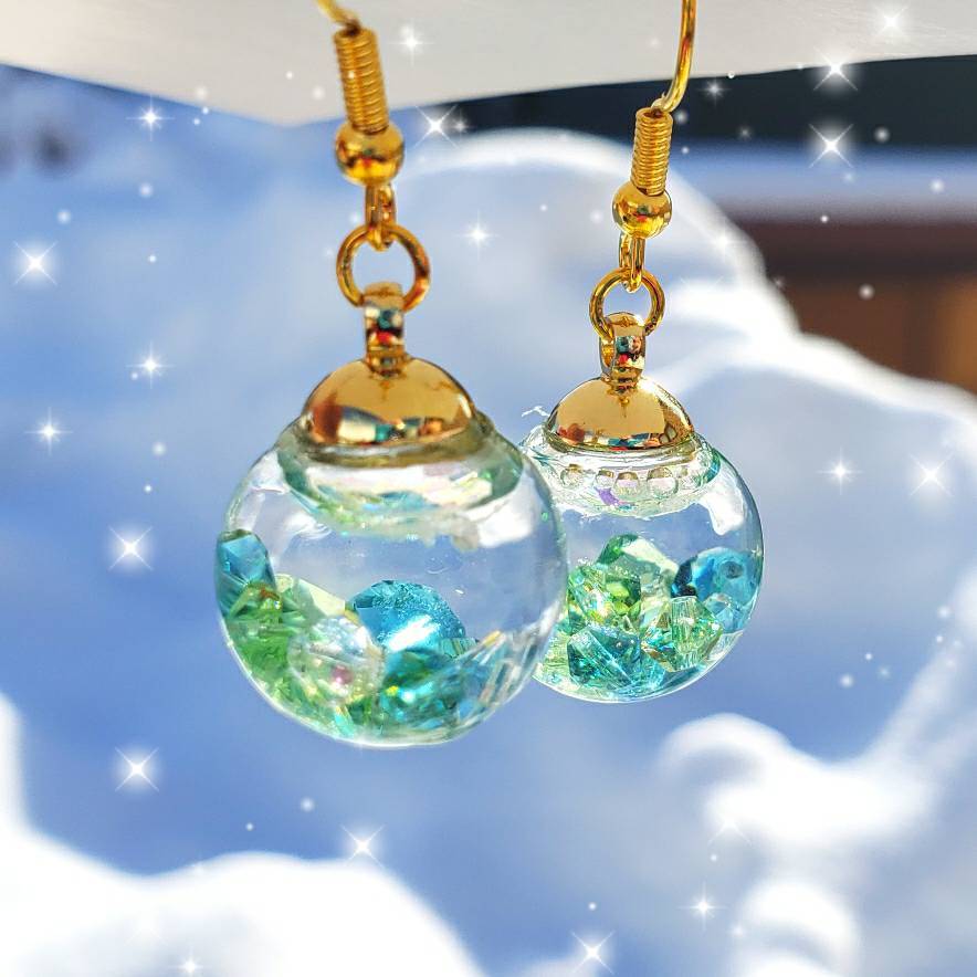 液体ガラスドーム スワロフスキー スノードーム ピアス 翡翠