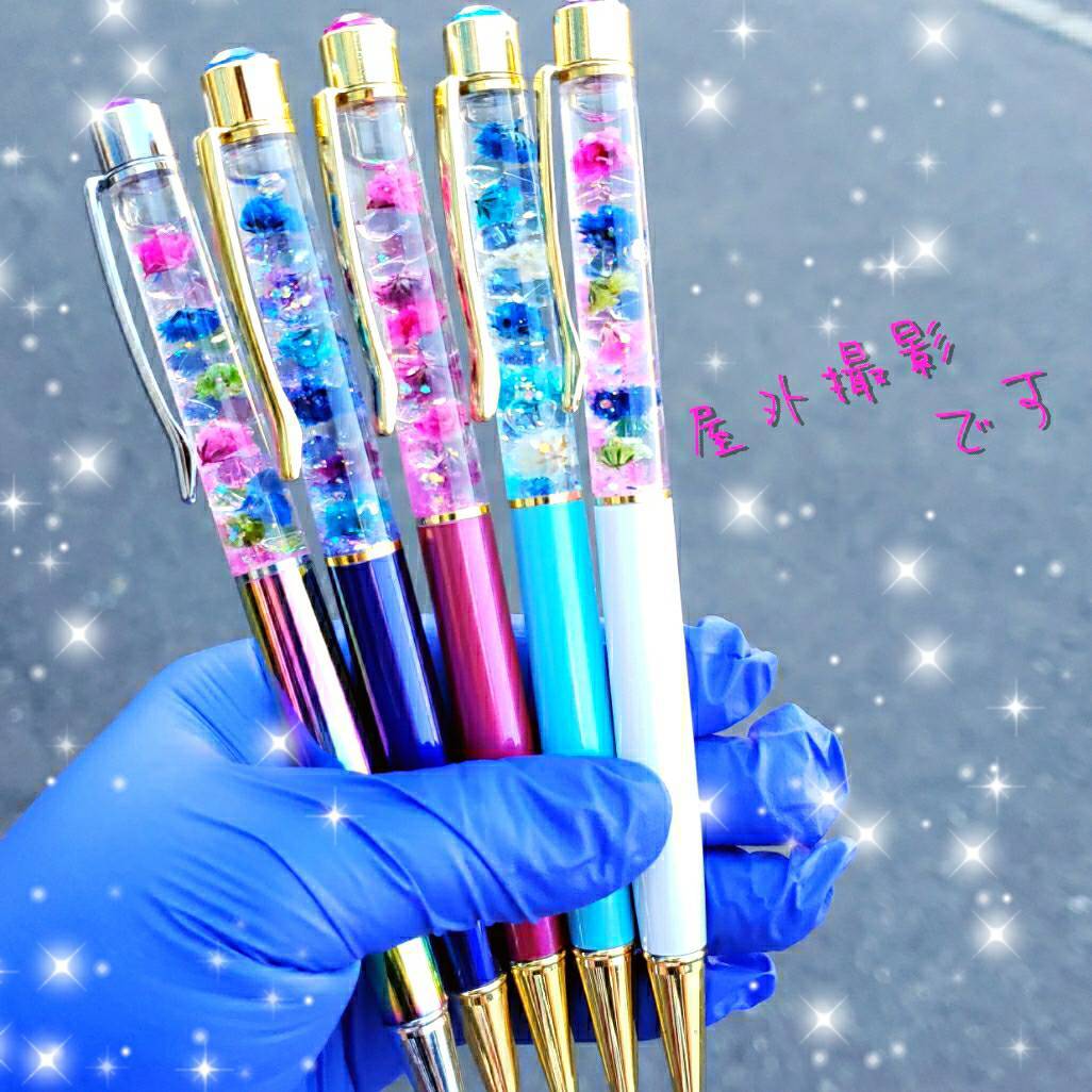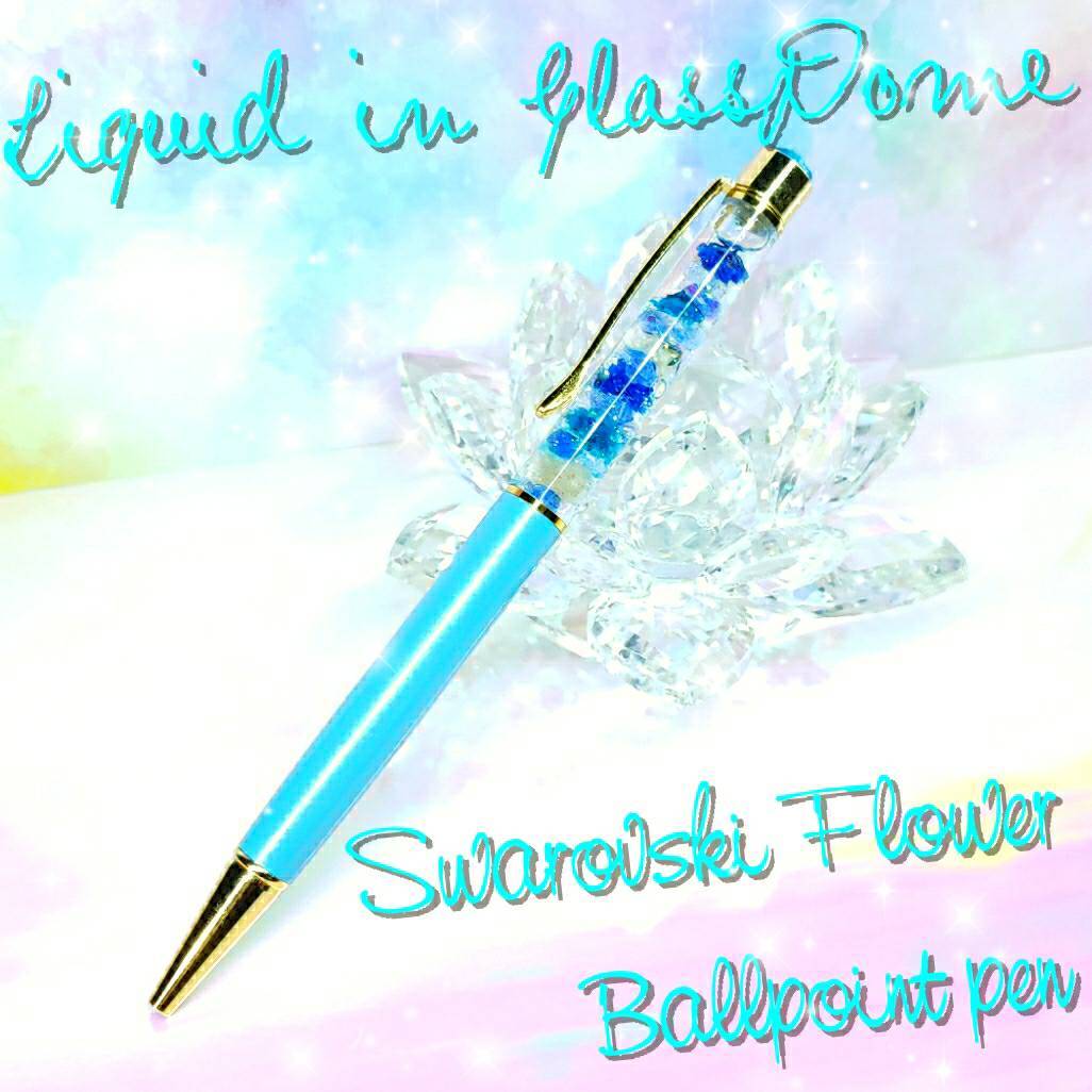 ハンドメイド 液体ガラスドーム スワロフスキー フラワー 液体ボールペン 水色