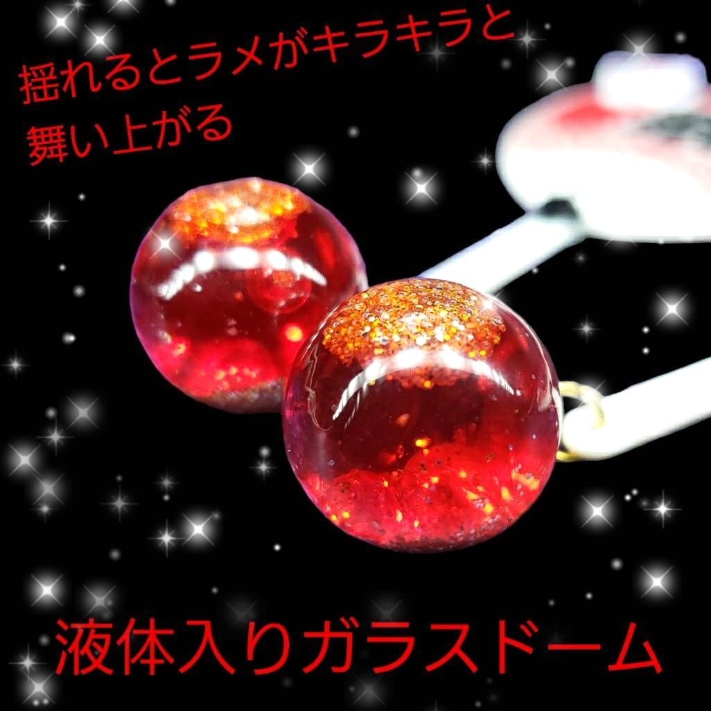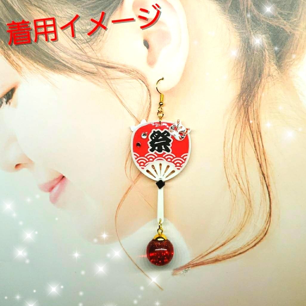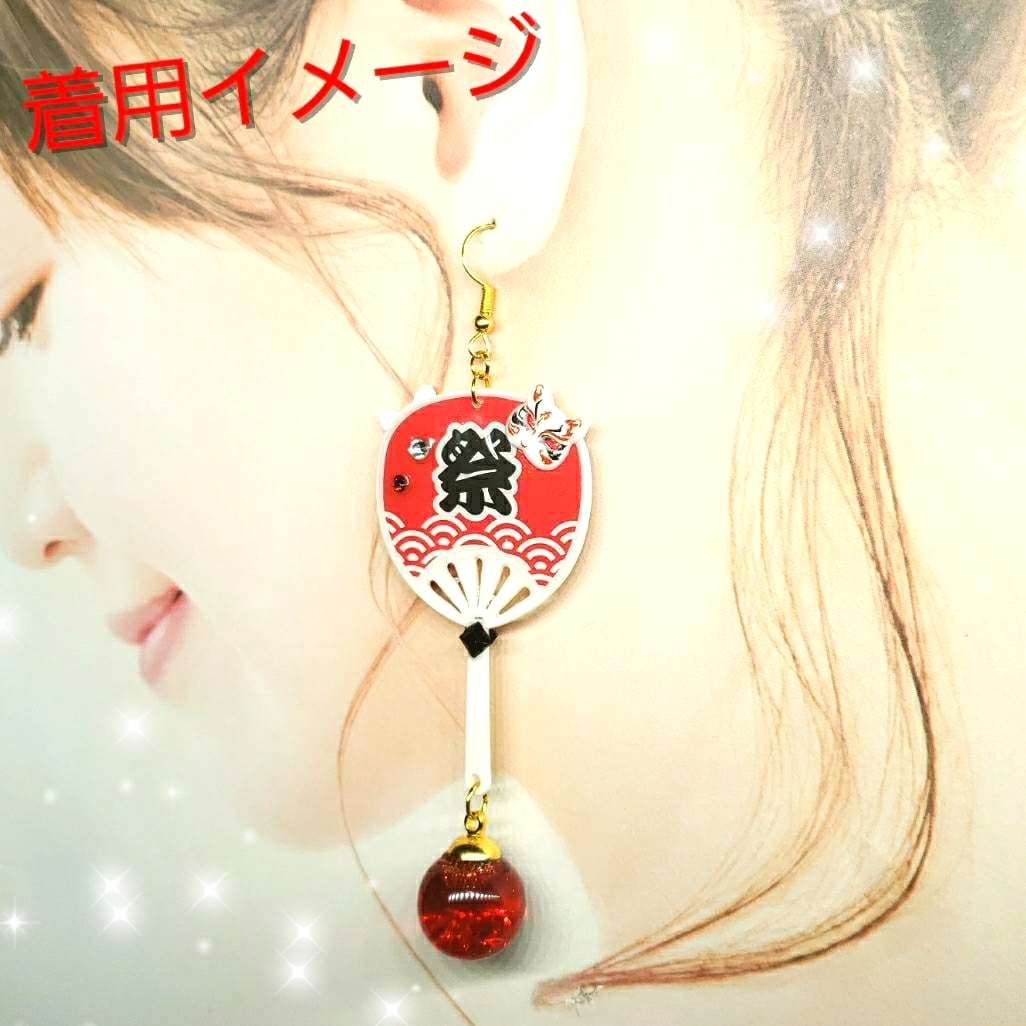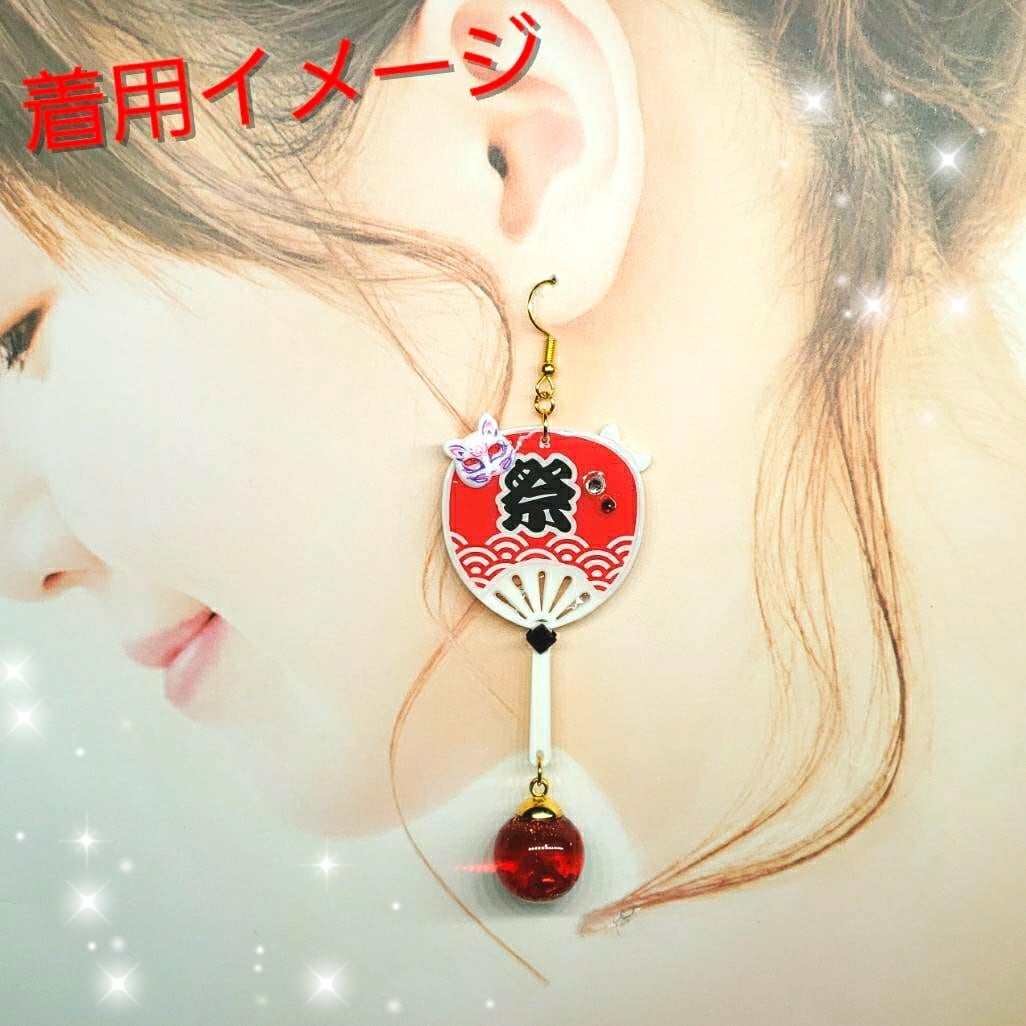 ꫛꫀꪝ✨数量限定❗液体ガラスドーム 夏祭り 狐面 団扇 ピアス左右 赤
